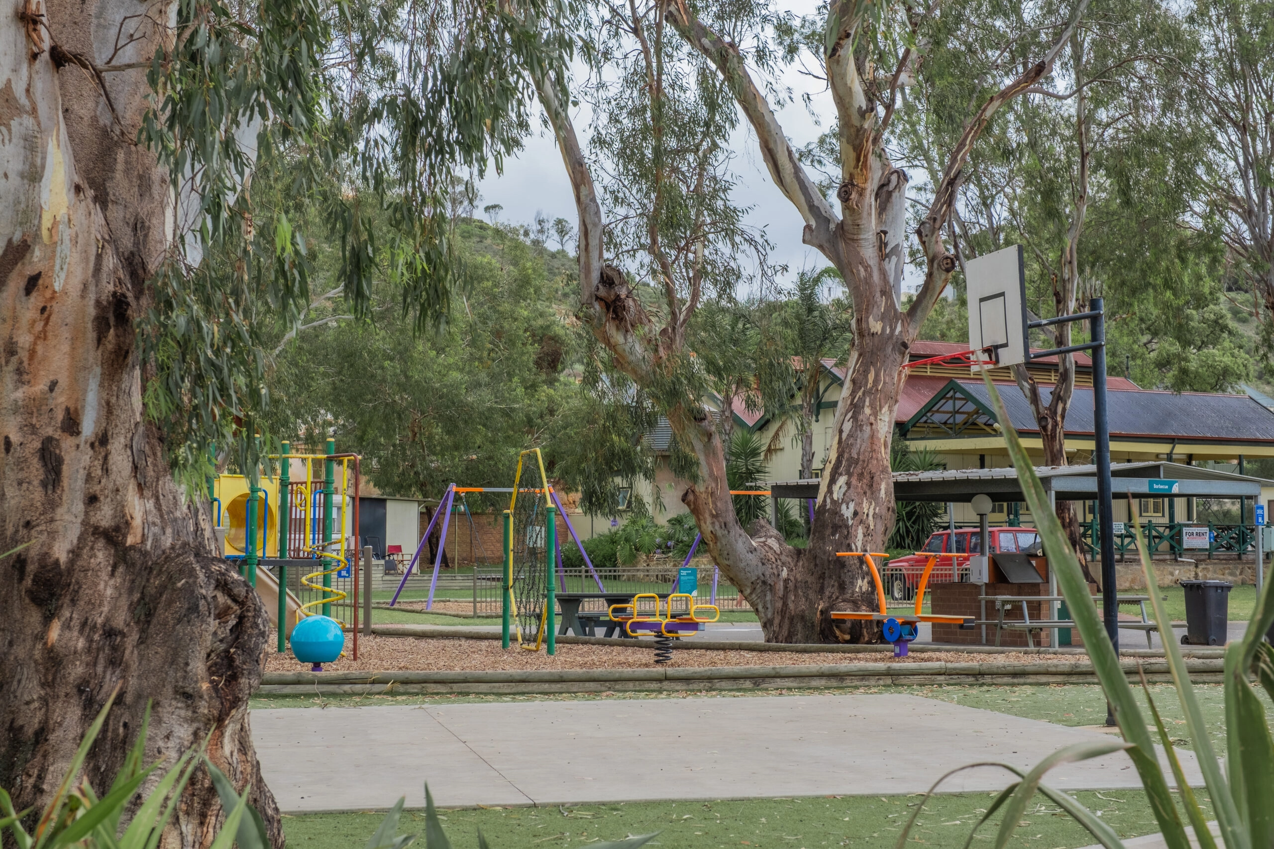 Kids can bounce between the playground, tennis court and basketball hoop, or join in a friendly lawn game near the camp kitchen.