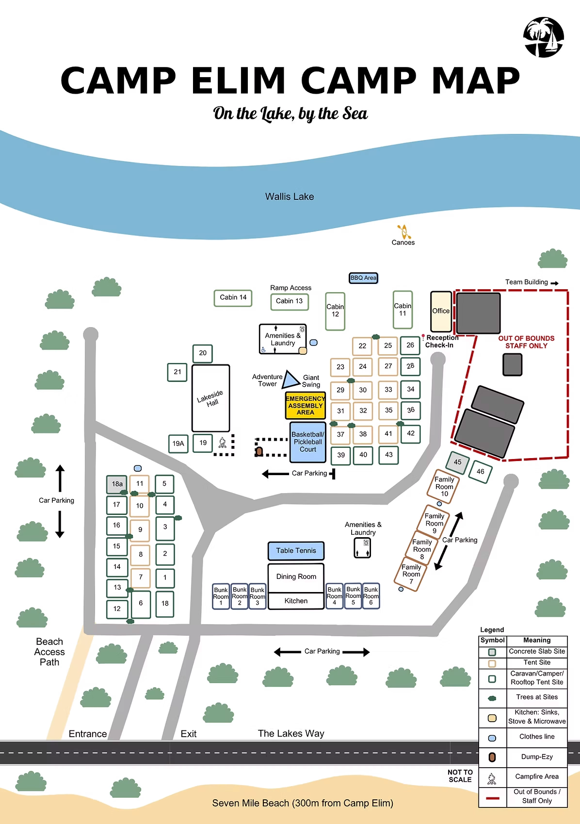 Booti Booti National Park surrounds Camp Elim, offering bushwalking, wildlife spotting and the serene Seven-Mile Beach.