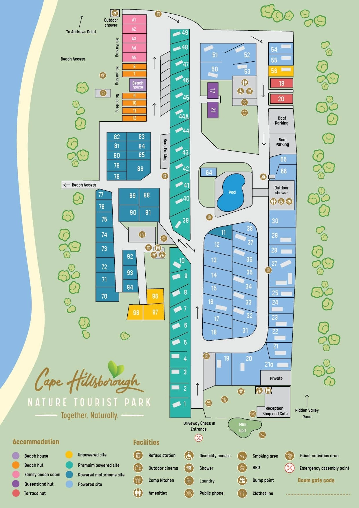 Outside of the park, the closest sport for a meal or a drink is the town of Seaforth approximately 15 minutes drive away. Here you’ll find the Seaforth Bowls Club, a classic coastal bowlo with cold, well priced drinks and counter meals as well as the Seaforth Pitt Stop Classic Cafe which also doubles as a Post Office/General Store.