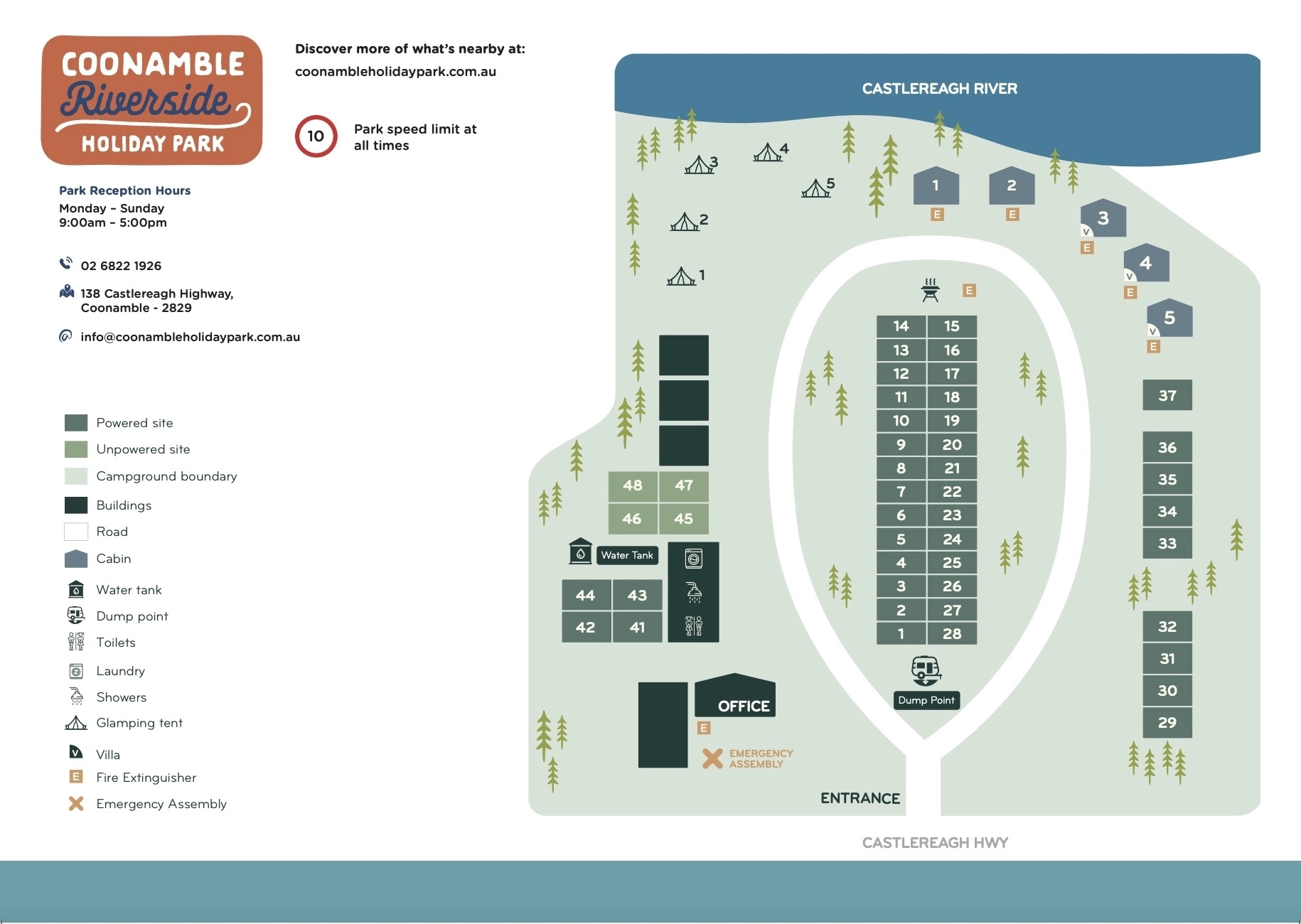 Check In is 11am for Sites and 2pm for Cabins, Check Out is 10am for all accommodation.