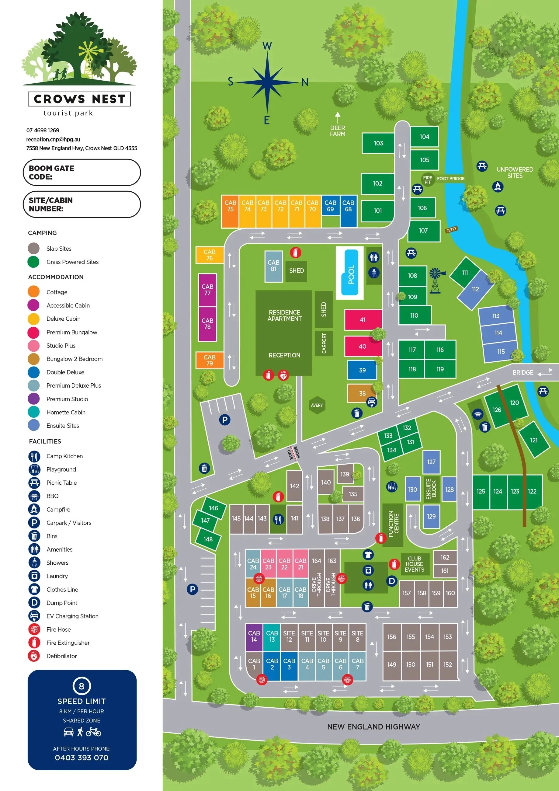 Check In is 11am for Sites, 2pm for Cabins, and Check Out is 10am for all accommodation.