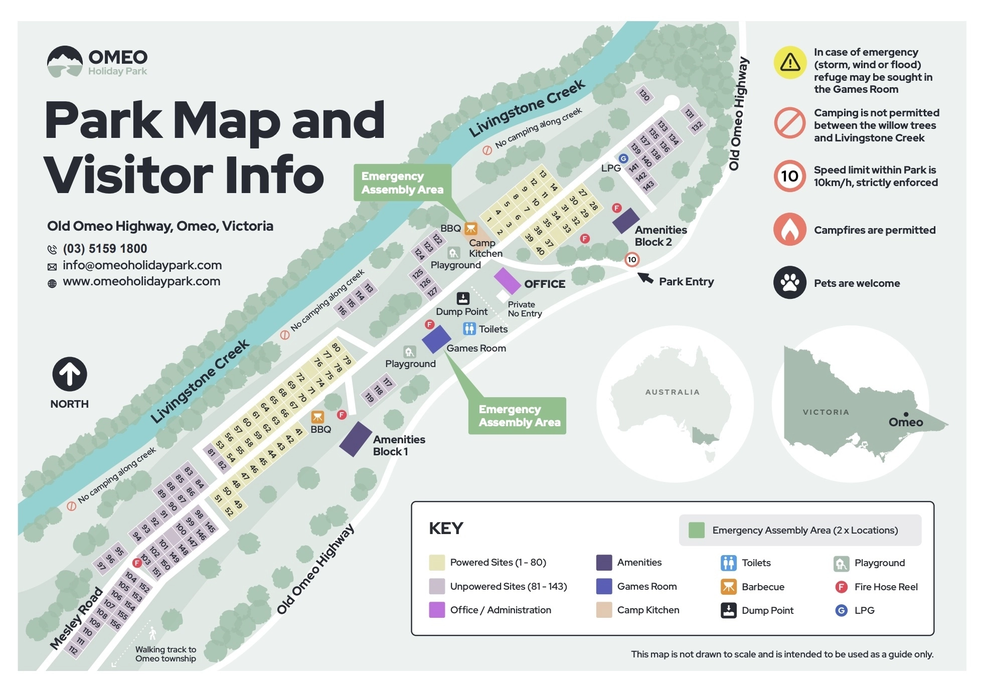 If your preference is to cook on site, the park is a Camp Kitchen and several barbecues which will more than do the job.
